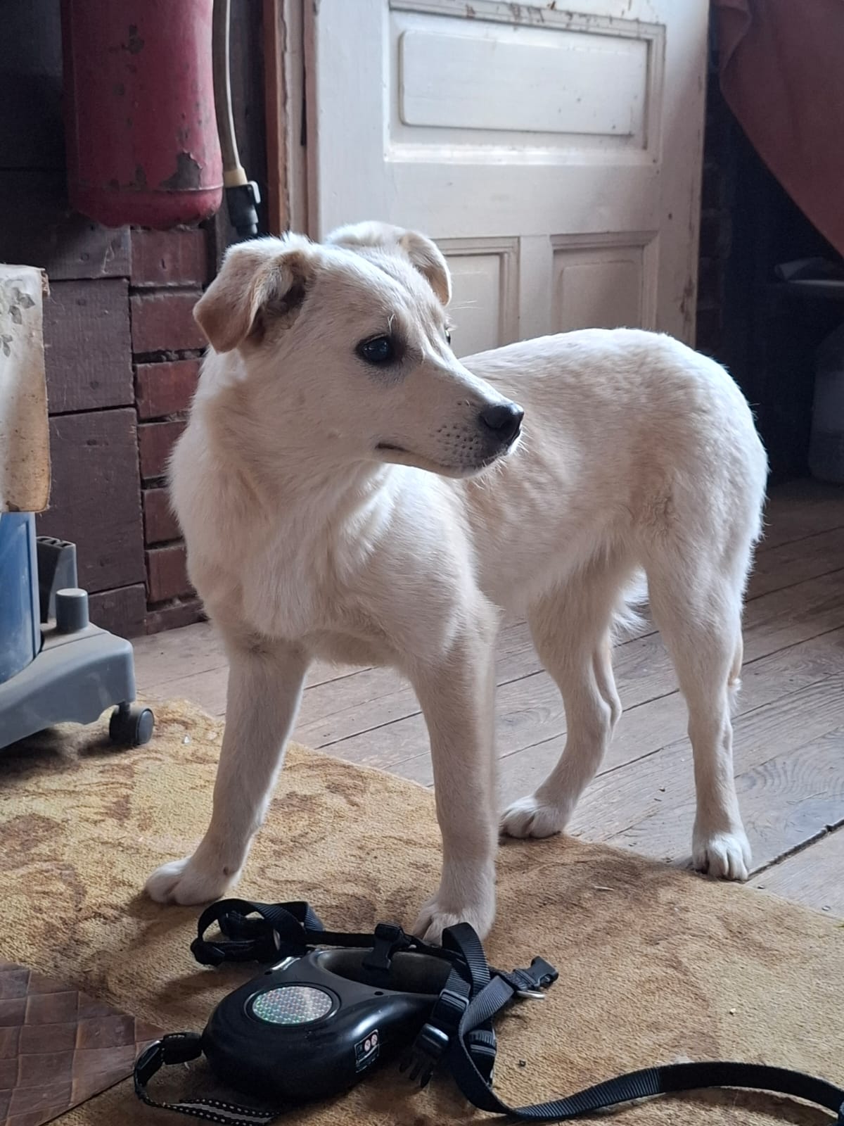ihr helles, cremefarbenes Fell, leicht strubbelig vom nächsten Abenteuer, die wachen Augen und ihre süßen Knicköhrchen – man sieht ihr einfach an, dass sie voller Tatendrang steckt.