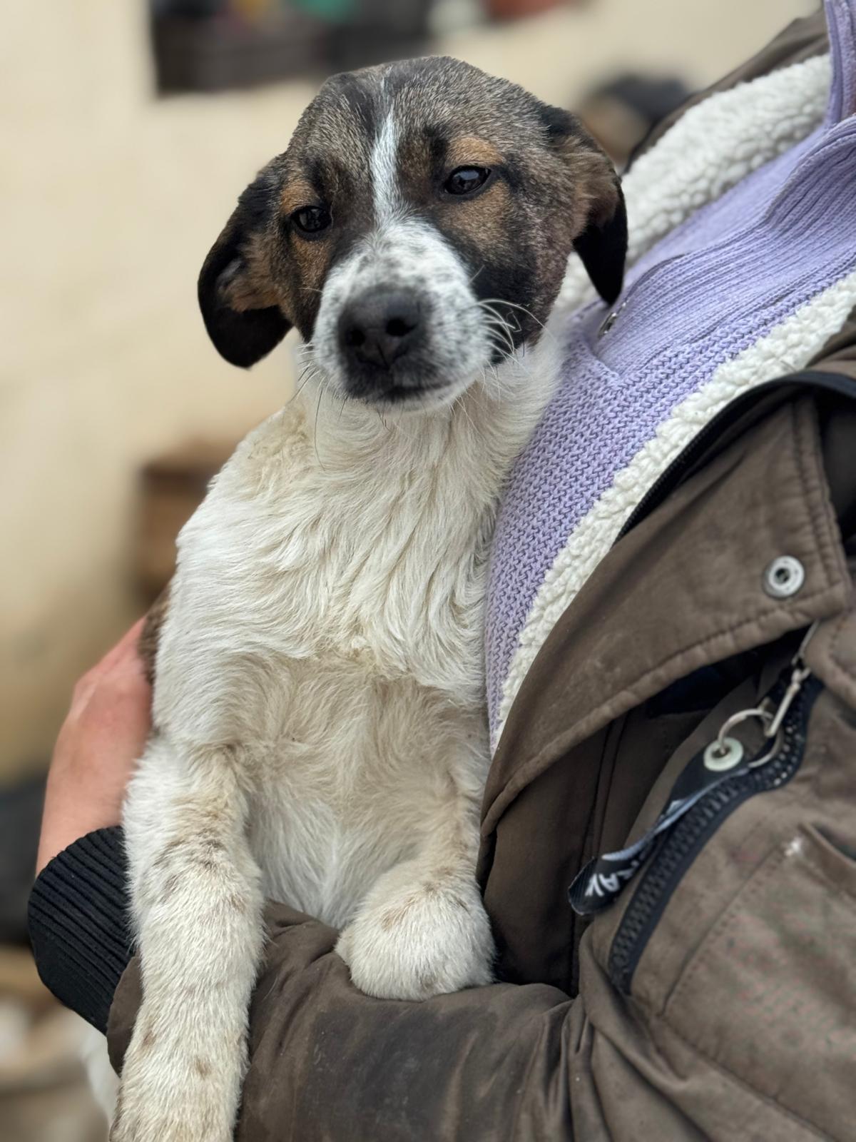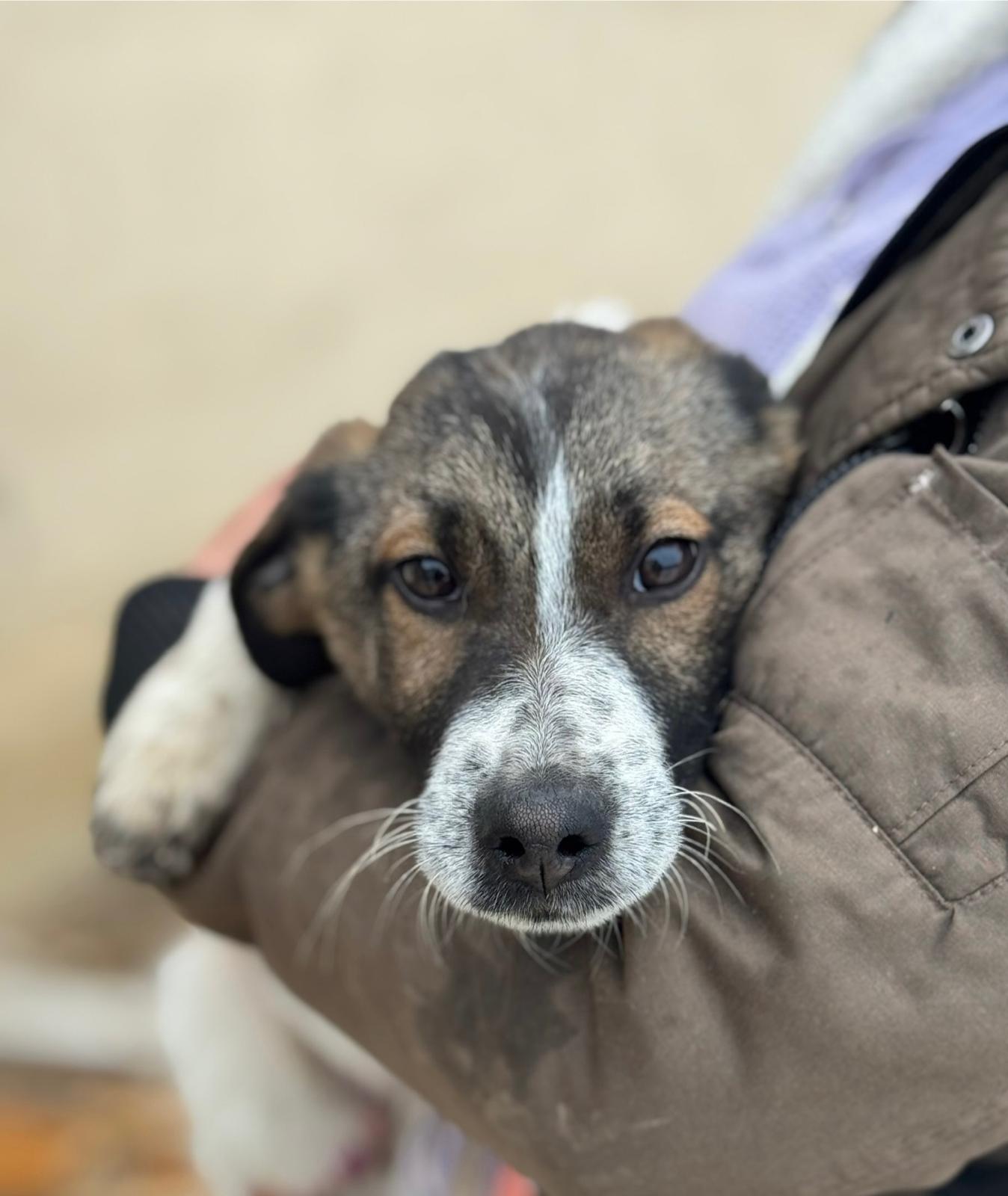 mein weißes Fell mit den dunklen Abzeichen, die markante Gesichtszeichnung und dieser konzentrierte Blick lassen erahnen, dass ich nicht nur süß, sondern auch ziemlich schlau bin. Meine Rute wedelt fröhlich – meistens, weil ich gerade etwas Spannendes entdeckt habe. Oder plane.