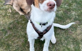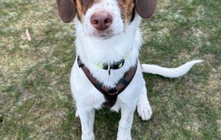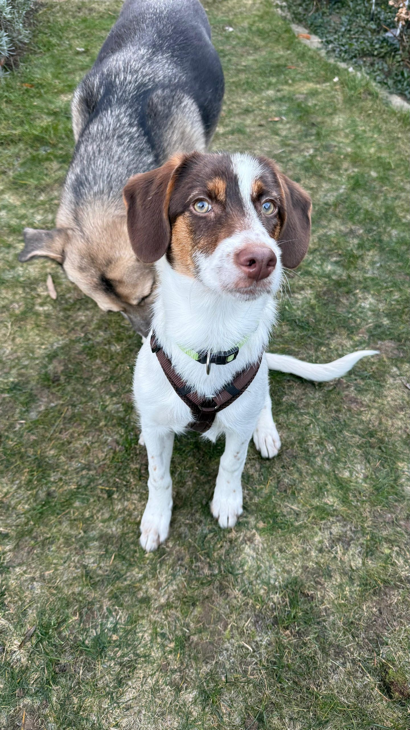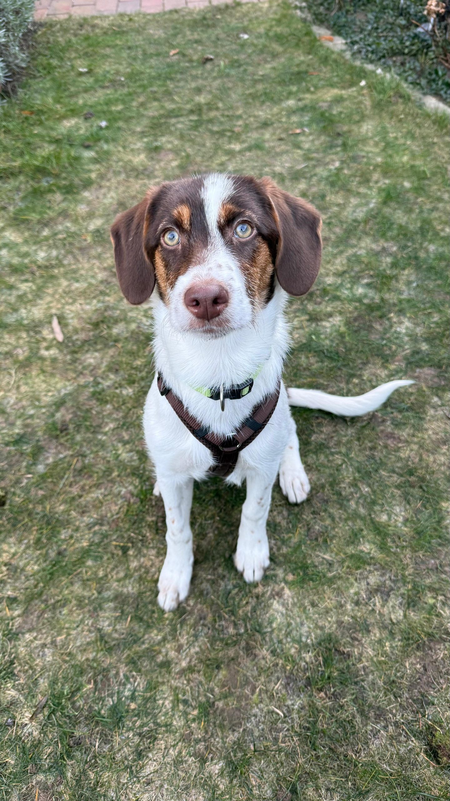 Duda ist eine von diesen Hündinnen, bei denen man sich fragt, wie man gleichzeitig so niedlich, so schlau und so lustig sein kann. Mit ihrem frechen, wachen Blick, den weichen Schlappohren und ihrer hübschen Zeichnung ist sie ein echter Hingucker – und ja, ein kleines bisschen weiß sie das auch.