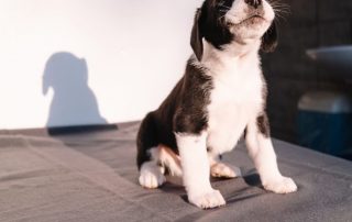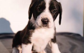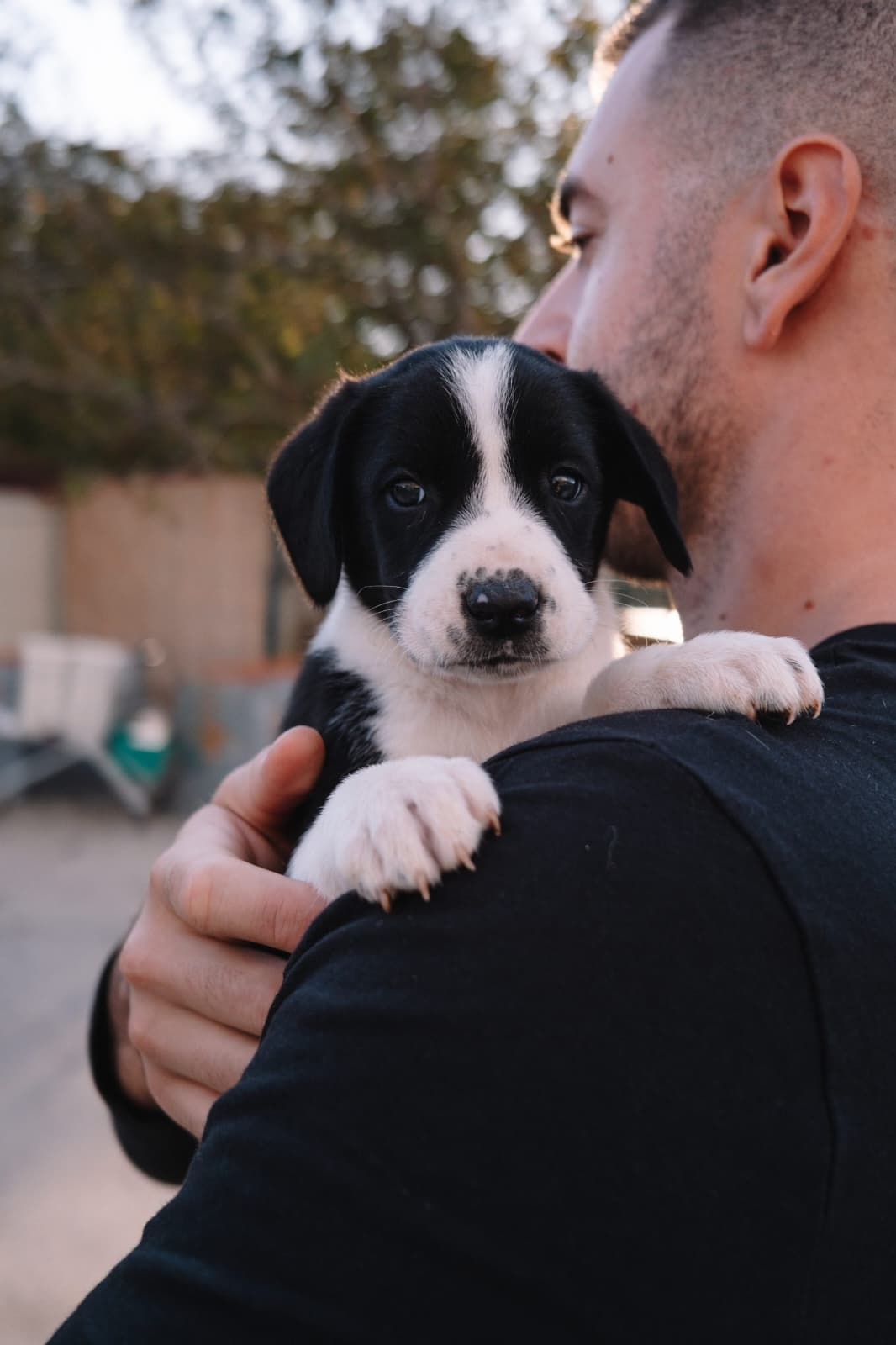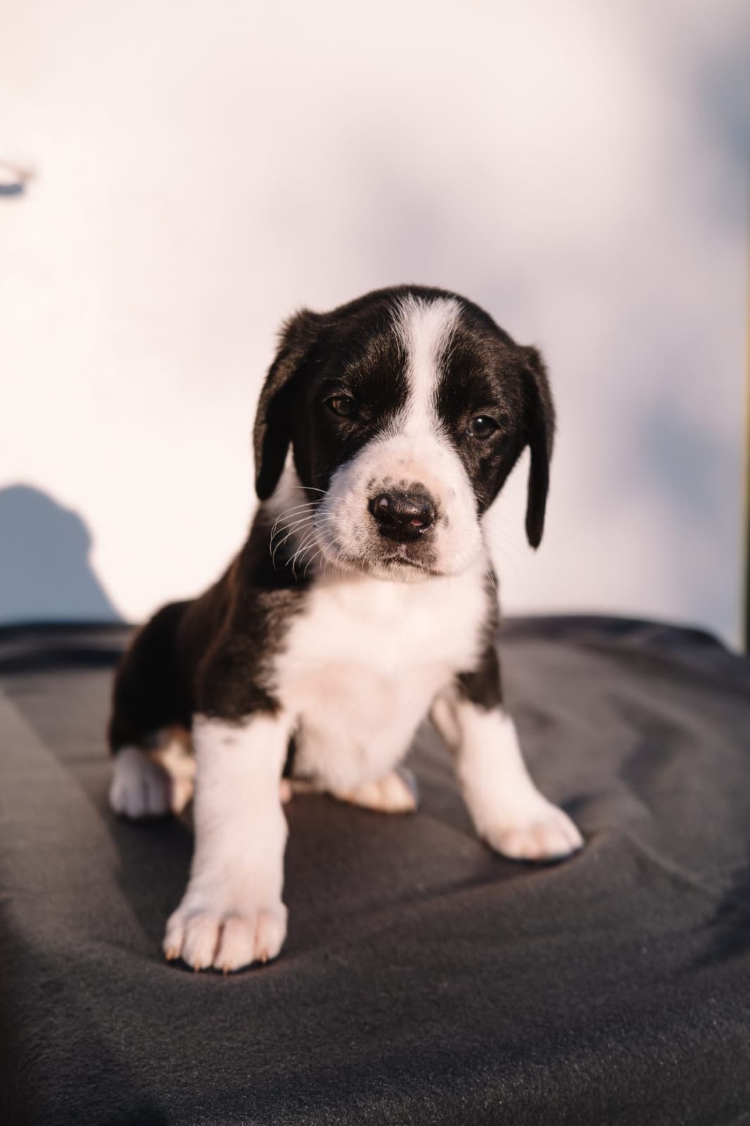 Sein schwarz-weißes Fell wirkt wie sorgfältig gemalt, mit einer hellen Zeichnung im Gesicht, die ihm einen fast nachdenklichen Ausdruck verleiht. Mal schaut er aufmerksam, mal ein kleines bisschen verträumt, als würde er gerade überlegen, wie die Welt wohl schmeckt. Seine großen Welpenpfoten versprechen schon jetzt, dass aus diesem zarten Wesen einmal ein stattlicher Hund wird – im Moment stolpert er damit aber noch genauso charmant durchs Leben wie es sich für einen Welpen gehört.