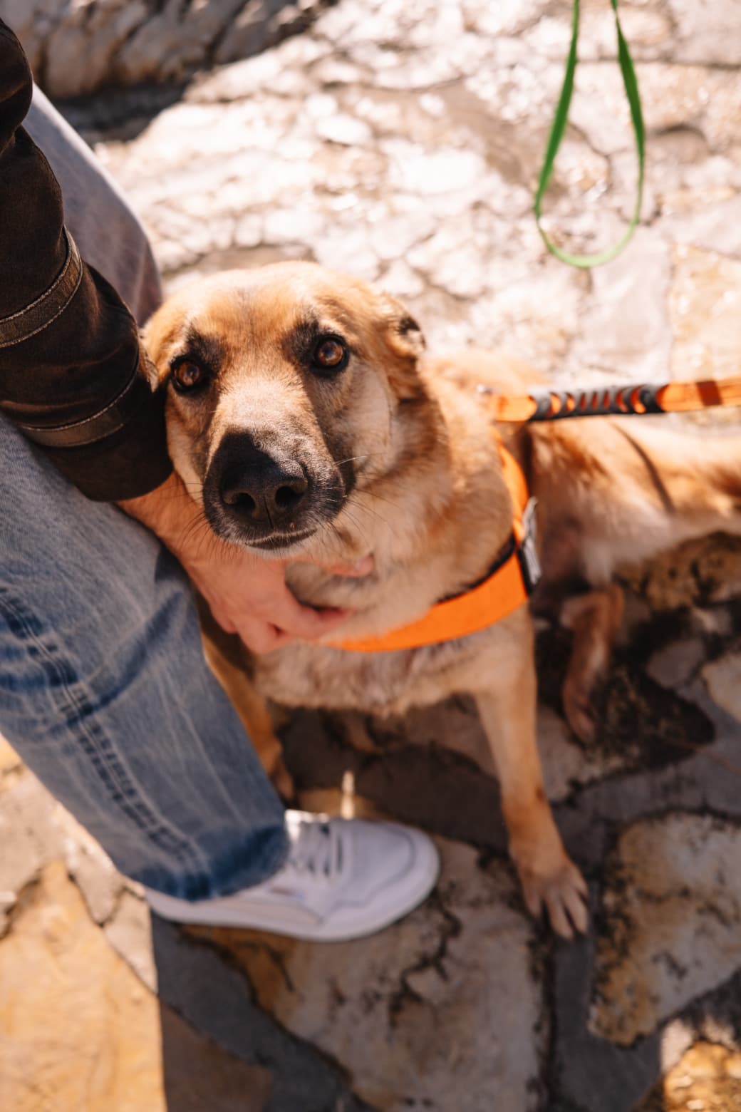 Mit ihrem goldbraunen Fell, der dunklen Gesichtsmaske und den warmen, bernsteinfarbenen Augen ist sie eine wahre Schönheit. Ihr Blick erzählt Geschichten – von Stärke, Sanftmut und der tiefen Sehnsucht nach Geborgenheit. Gaia erinnert optisch an eine Mischung aus Belgischem und Deutschem Schäferhund: elegant, ausdrucksstark und aufmerksam. Doch hinter ihrem wachen Blick steckt kein stürmischer Arbeitshund, sondern eine sanfte Seele, die Nähe, Ruhe und Vertrauen sucht.