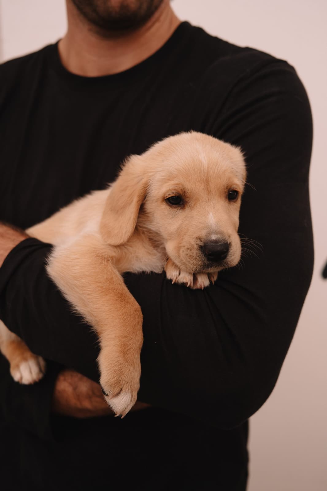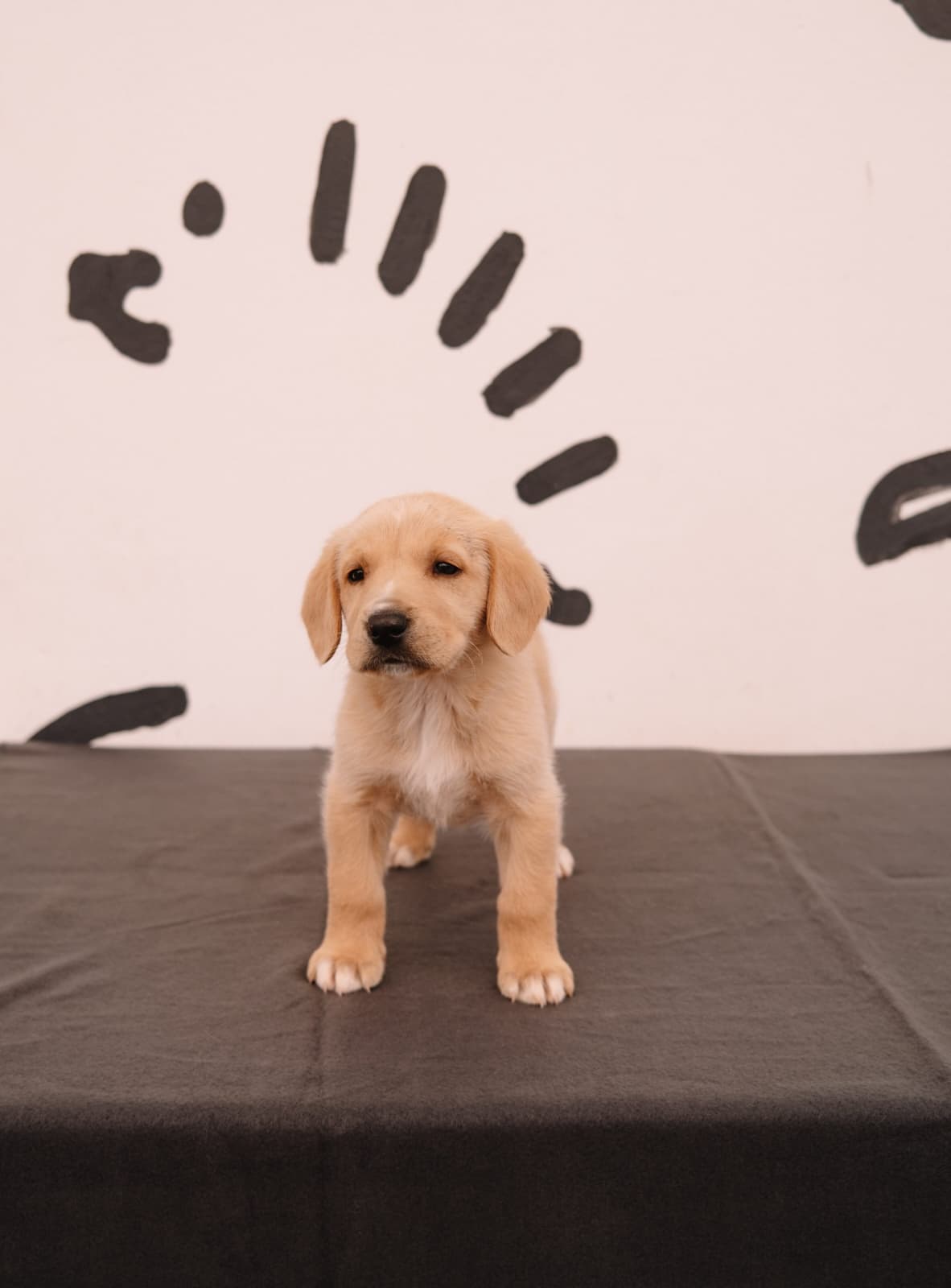 Optisch ist Johann ein echter kleiner Charmeur. Sein helles, weiches Fell wirkt wie in warmem Licht getaucht, seine dunklen Knopfaugen schauen ruhig und aufmerksam in die Welt. Die Schlappohren liegen noch ganz welpentypisch am Kopf an, und seine großen, etwas zu kräftigen Pfoten verraten schon jetzt, dass er noch viel hineinwachsen wird. Wenn Johann steht, wirkt er fast ein bisschen ernst – bis man merkt, dass hinter diesem Ausdruck pure Neugier steckt.