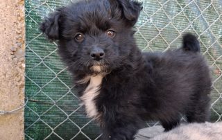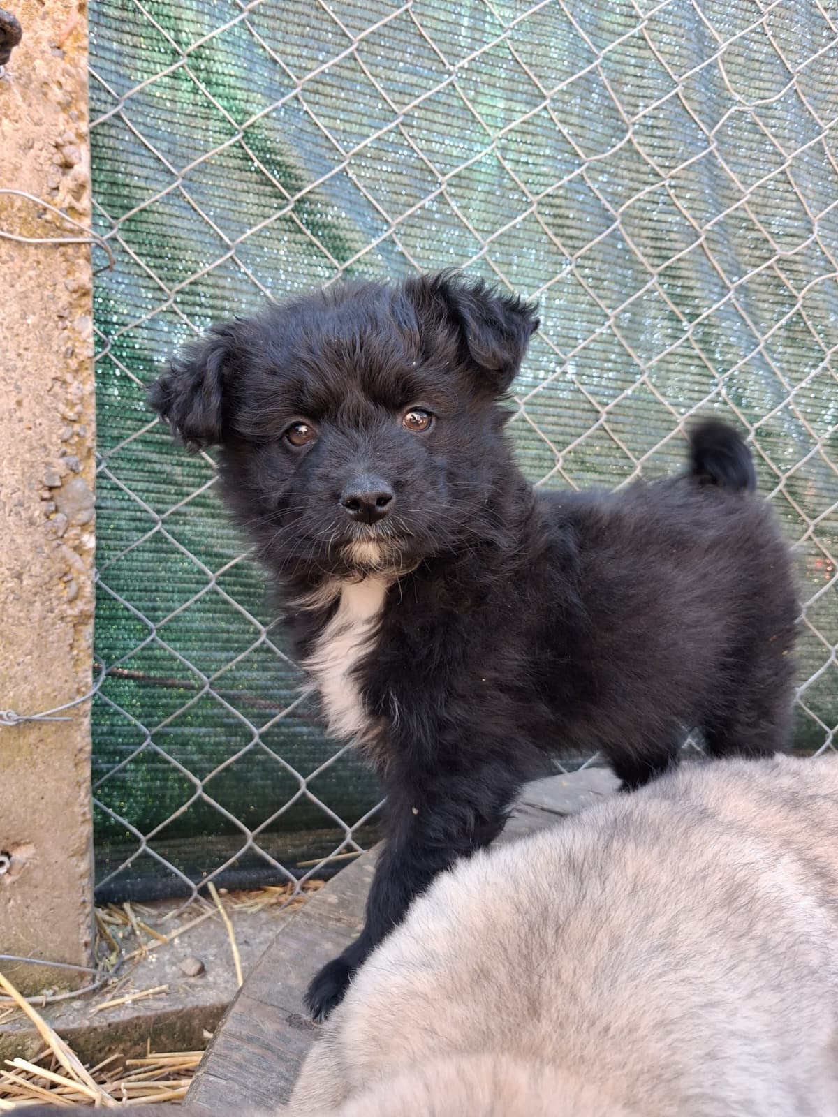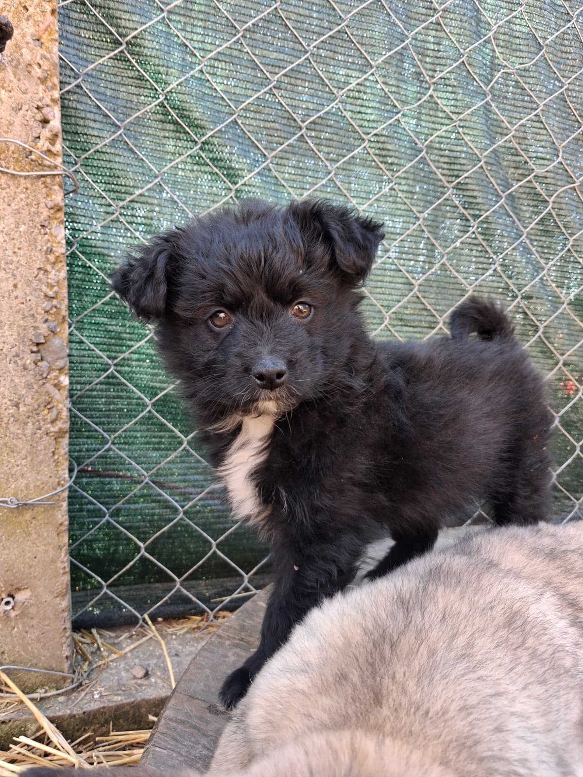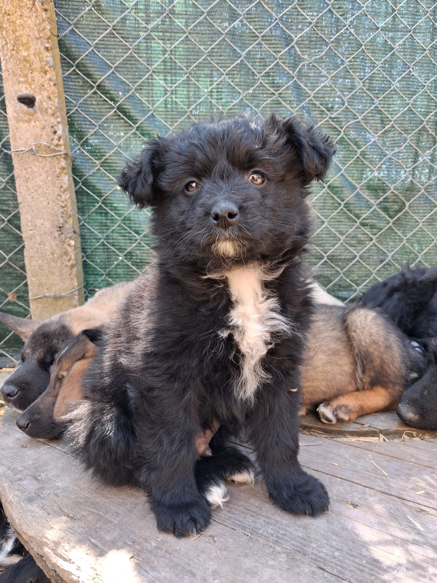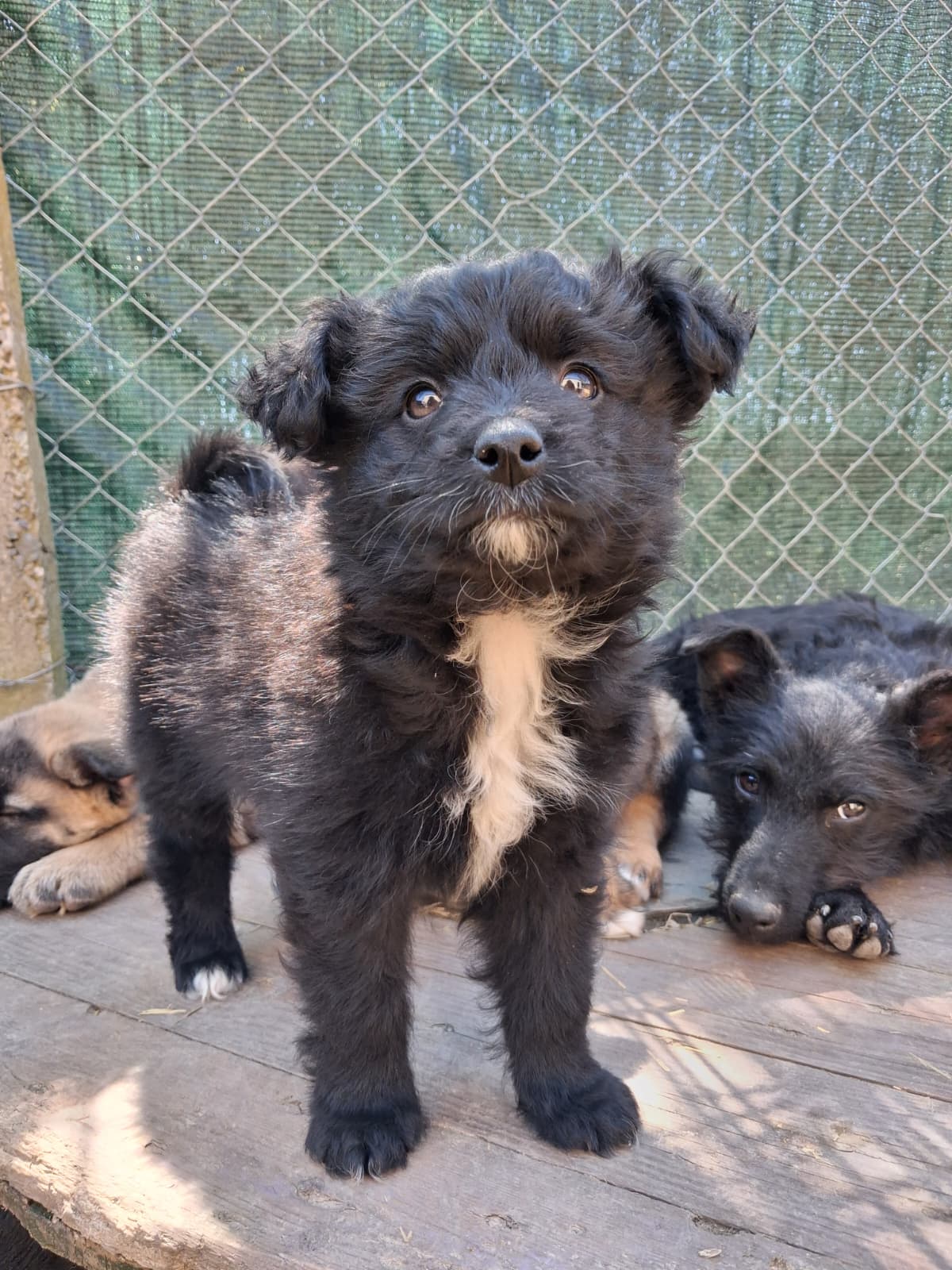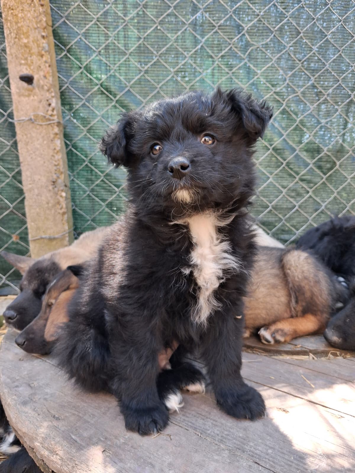 Dieser kleine Rüde fällt sofort auf: sein weiches, leicht strubbeliges schwarzes Fell, die wuscheligen Öhrchen und dieser wunderschöne weiße Brustfleck, der wirkt, als hätte ihn jemand ganz bewusst dort platziert.