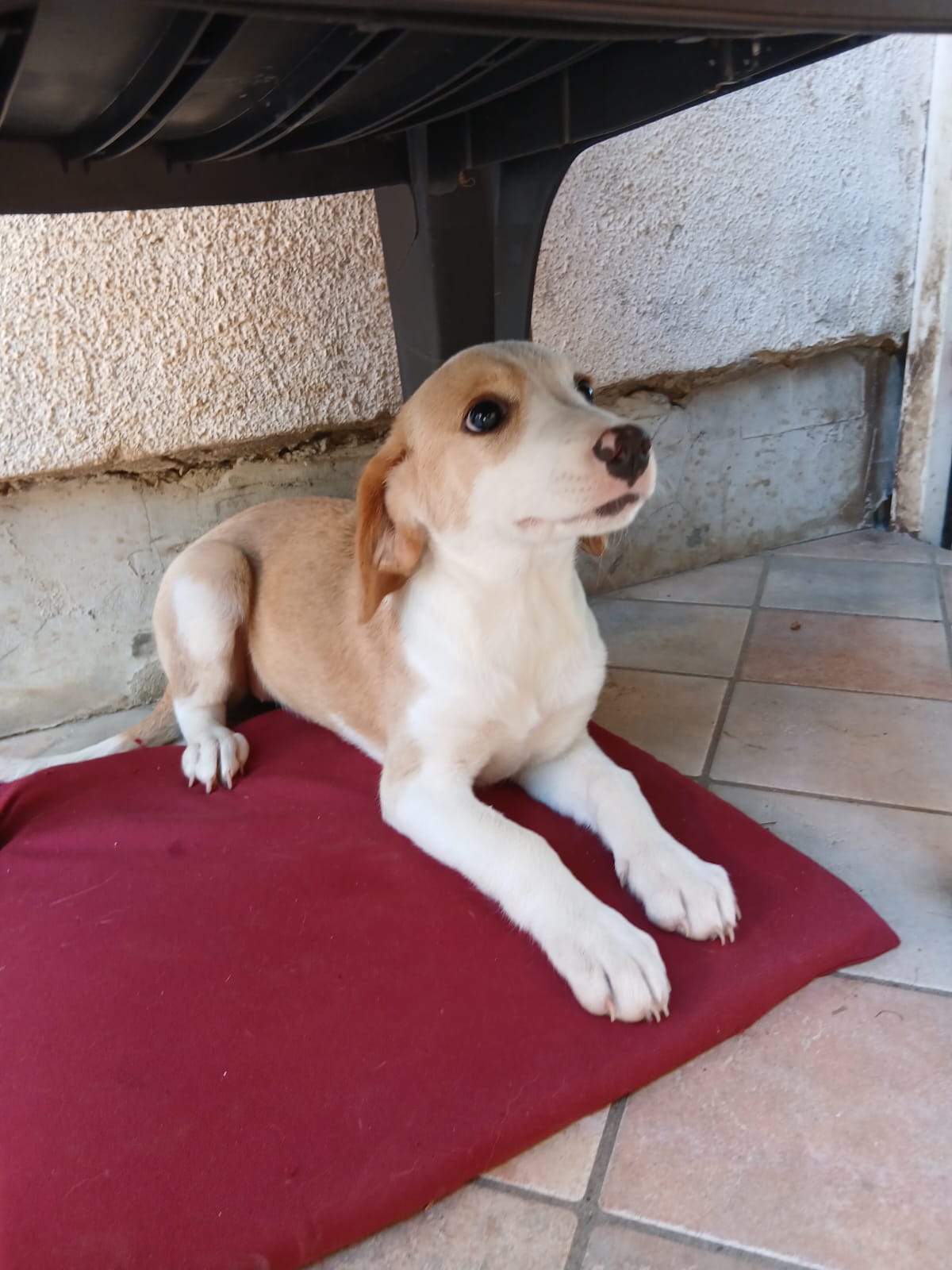 Maki lebt auf einer Pflegestelle mit anderen Hunden und Katzen – völlig harmonisch. Sogar die Nachbarn haben sie nicht bemerkt. Kein Witz: Sie ist so ruhig und höflich, dass sie quasi wie ein kleines Geheimnis durch den Alltag schwebt. Ein sehr niedliches Geheimnis mit langen Beinchen und einer Honig-Crème-Fellzeichnung, die aussieht, als hätte jemand ganz verliebt mit dem Pinsel über sie gestrichen.