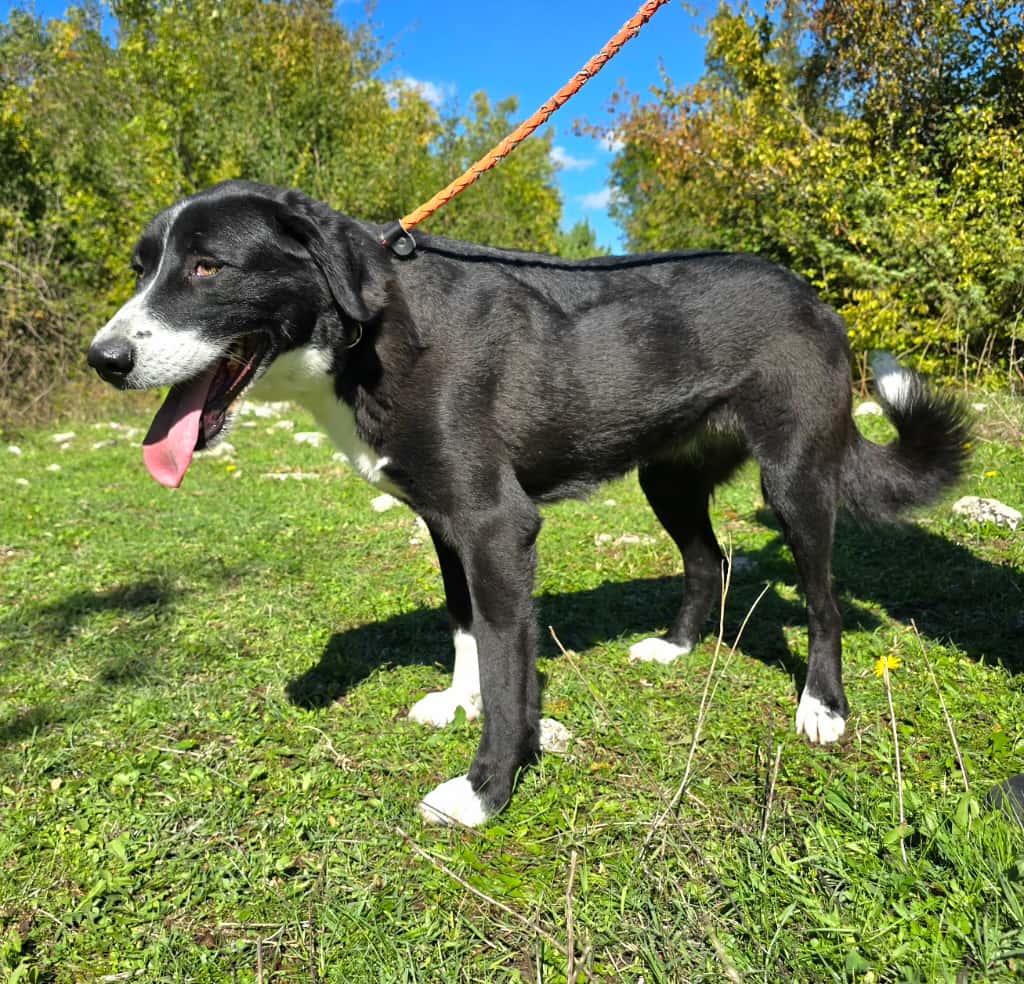 Rona ist einer dieser Hunde, die man ansieht und sofort denkt: „Ach du meine Güte, was für eine freundliche Seele!“ Mit ihren langen Beinen, dem eleganten schwarz-weißen Fell und diesem strahlenden „Ich-freu-mich-über-euch-alle“-Lächeln sieht sie ein bisschen aus wie ein Hund, der im Smoking geboren wurde – nur mit der kleinen Besonderheit, dass ihre Zunge gefühlt immer ein paar Zentimeter zu lang ist und sie sie stolz wie ein Markenzeichen trägt. Ohne jeden Zweifel: Rona ist nicht einfach ein Hund. Rona ist ein Herz auf vier Pfoten.