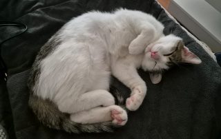 Sammys Geschichte beginnt als (noch kleineres Kitten) in einem Fischerdorf. Sammys Mutter brachte sie zu einem Mann, der sich um seine zwei eigenen Katzen gut kümmerte. Eine Weile blieb Sammys Mutter mit an diesem Ort, doch dann verließ sie ihr kleines Fellknäuel, vielleicht weil sie wusste dass sie dort gut mit Futter versorgt wird? Leider wendet sich die Geschichte dann wie in einem Disneyfilm – die beiden vorhandenen älteren Katzen, aka „die bösen Stiefschwestern“ akzeptierten die kleine Sammy nicht, verletzten sie sogar an der Pfote, sodass der Mann eine unserer Tierschützerinnen informierte.